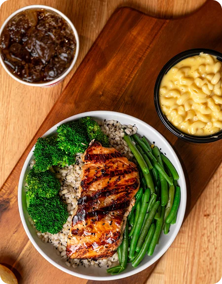 Our sides and salads are made fresh every day, using premium, locally sourced vegetables and all-natural ingredients. From crisp greens to hearty sandwiches, wraps, and bowls, everything is cooked to order with freshness and quality at the heart of every dish.